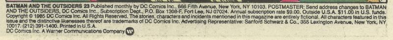 Outsiders [Batman [Bruce Wayne]; Geo-Force [Brion Markov]; Black Lightning [Jefferson Pierce]; Katana [Tatsu Yamashiro]; Metamorpho [Rex Mason]; Halo [Gabrielle Doe] (origin)]; Aurakles