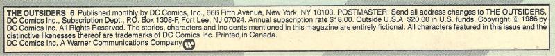 Outsiders [Halo; Metamorpho; Katana; Geoforce; Black Lightning]; Kobra; Captain Carrot (cameo); Flash [Jay Garrick] (cameo); Adam Strange (cameo); Spectre (cameo); Bwana Beast (cameo); Starfire [Koriand'r] (cameo); Dr. Midnight (cameo); Gentleman Ghost (cameo); Batman (cameo); Creeper (cameo); Guardian of the Galaxy (cameo); Warlord (cameo); Bat-Mite (cameo); Aquaman (cameo); Detective Chimp (cameo); Elongated Man (cameo); Tomar-Re (cameo); Amythyst (cameo); Swamp Thing (cameo); Demon [Etrigan] (cameo); Cyborg [Victor Stone]; (cameo); Robotman (cameo); Wildcat (cameo); Hawkman (Cameo); Dr. Fate (cameo); Nightwing (cameo); Firestorm (cameo); Superman (cameo); Black Canary (cameo); Bizarro (cameo); Bouncing Boy (cameo); Martian Manhunter (cameo); Joker (cameo); Jonah Hex (cameo); Wonder Woman (cameo); Penguin (cameo); Dr. Sivana (cameo); Sgt. Rock (cameo)