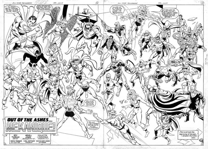 With the Golden Age Aquaman, in his first appearance in this feature as explained by Roy Thomas in a later letters page. Story continued from previous issue; story concludes next issue.
