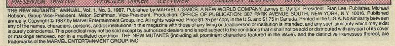 This story occurs between New Mutants (Marvel, 1983 series) #52 and #53. Sequel to X-Men Annual (Marvel, 1970 series) #7.