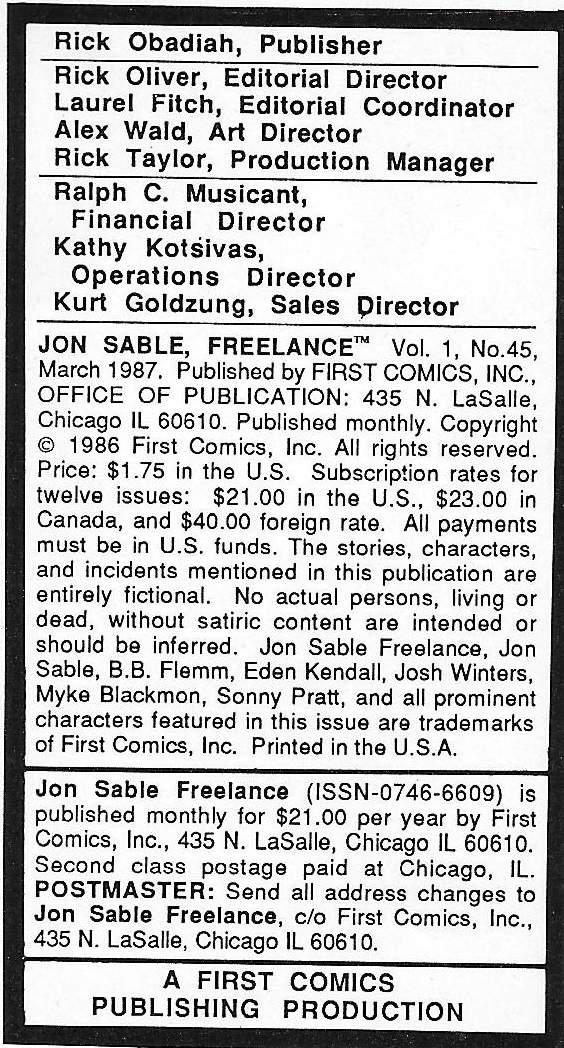 Grey Adler; Katy Daniels; Jon Sable; Glenn Forrest; Frederick Myles; Frank Harrington; Debra Lawson; Bonnie St. Charles; Marshall Cooper; Paul Goddard