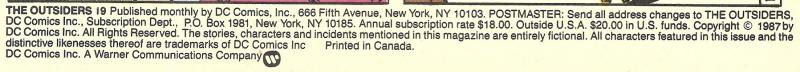 Outsiders [Batman [Bruce Wayne]; Geo-Force [Brion Markov]; Black Lightning [Jefferson Pierce]; Katana [Tatsu Yamashiro]; Metamorpho [Rex Mason]; Halo [Gabrielle Doe]; Looker [Lia Briggs]; Windfall (clone, introduction, joins the Outsiders)]; Masters of Disaster [Shakedown; Coldsnap [Darryl]; Heatstroke [Joanne]; New-Wave [Becky Jones]]; Sapphire Stagg; King Gregor