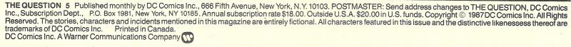 Hub City goes wild as the Mayor's mansion burns. The Question has the futile task of trying to keep order. Vic decides to return to the news business. Izzy cleans up his crooked cop act.