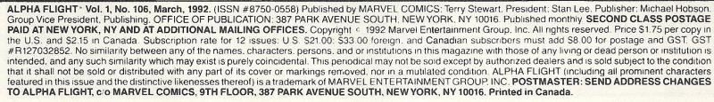 Alpha Flight [Guardian [Heather Hudson]; Box [Madison Jeffries]; Sasquatch; Puck; Northstar; Aurora; Diamond Lil; Windshear; Weapon Omega [Wildchild]]; Joanne Beaubier (death); Major Mapleleaf [Louis Sadler] (introduction); Mr. Hyde (villain); Invaders [Captain America [Steve Rogers]; Sub-Mariner [Prince Namor]; Human Torch [Jim Hammond]] (cameo flashback)
