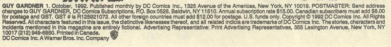 Guy Gardner; Guardians of OA; Green Lantern [Kilowog]; Maxwell Lord; Justice League [Blue Beetle [Ted Kord]; Booster Gold [Michael Jon Carter]; General Glory; Fire [Beatriz da Costa]; Ice [Tora Olafsdotter]; Superman [Clark Kent; Kal-El]]; Justice League Europe [Flash [Wally West]; Green Lantern [Hal Jordan]]; Bucky Sharp; Palindrordnilap; Boom; Thoom; Buk-50