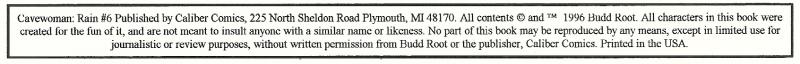 Back view of Cavewoman with long spear and dinosaur in background. Top half has image of Klyde growling at moon and flying creatures.