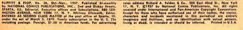 Disclose Notes: Owen Fitzgerald is credited as drawing one or more Flippity and Flop strips sometime in 1957, but all art in this issue appears to be Jim Davis' work.